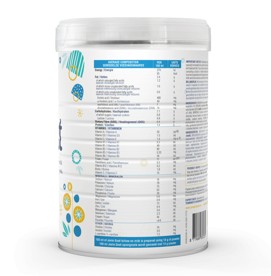 All Jovie products are made with high quality goat milk ensuring a rich, mild flavour in combination with easy to digest proteins. A unique combination of organic goat milk with advanced ingredients.