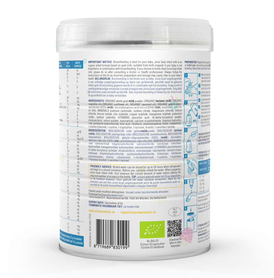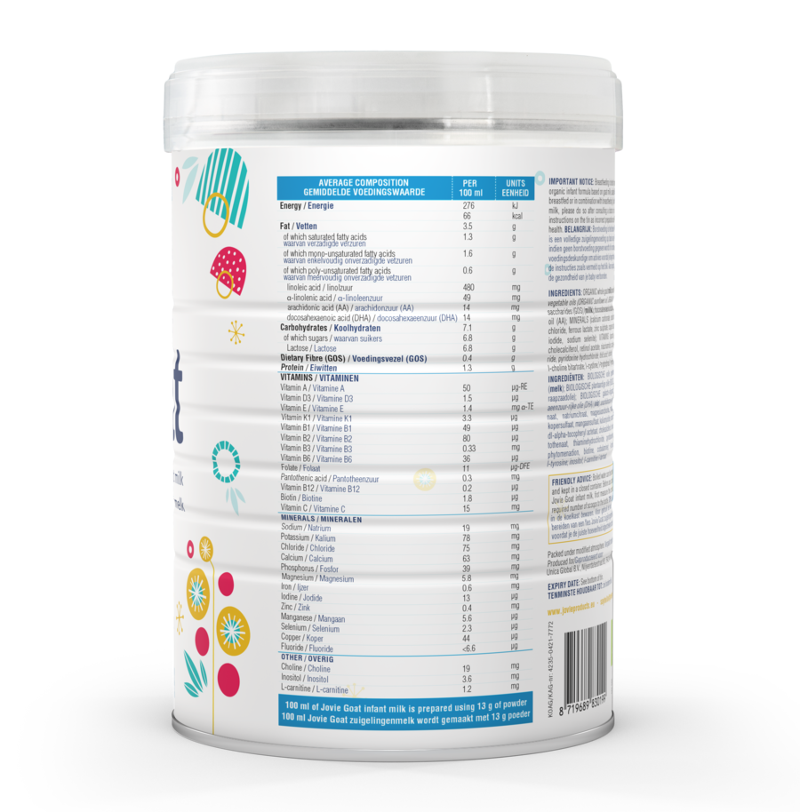 All Jovie products are made with high quality goat milk ensuring a rich, mild flavour in combination with easy to digest proteins. A unique combination of organic goat milk with advanced ingredients.