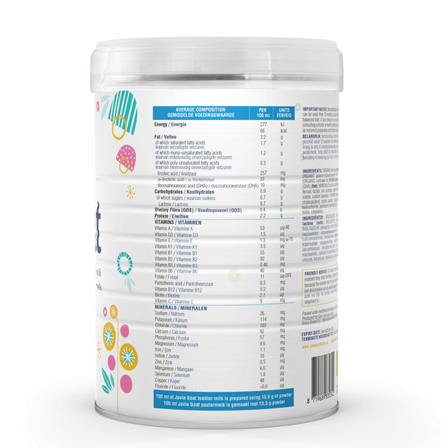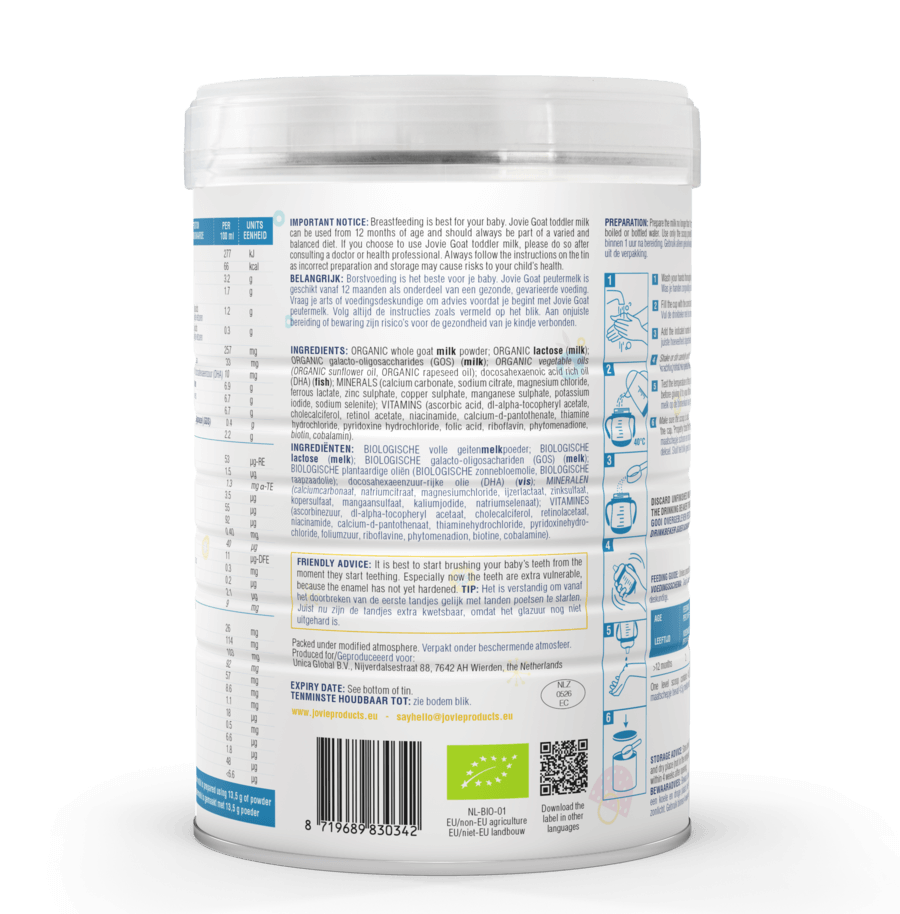 All Jovie products are made with high quality goat milk ensuring a rich, mild flavour in combination with easy to digest proteins. A unique combination of organic goat milk with advanced ingredients.